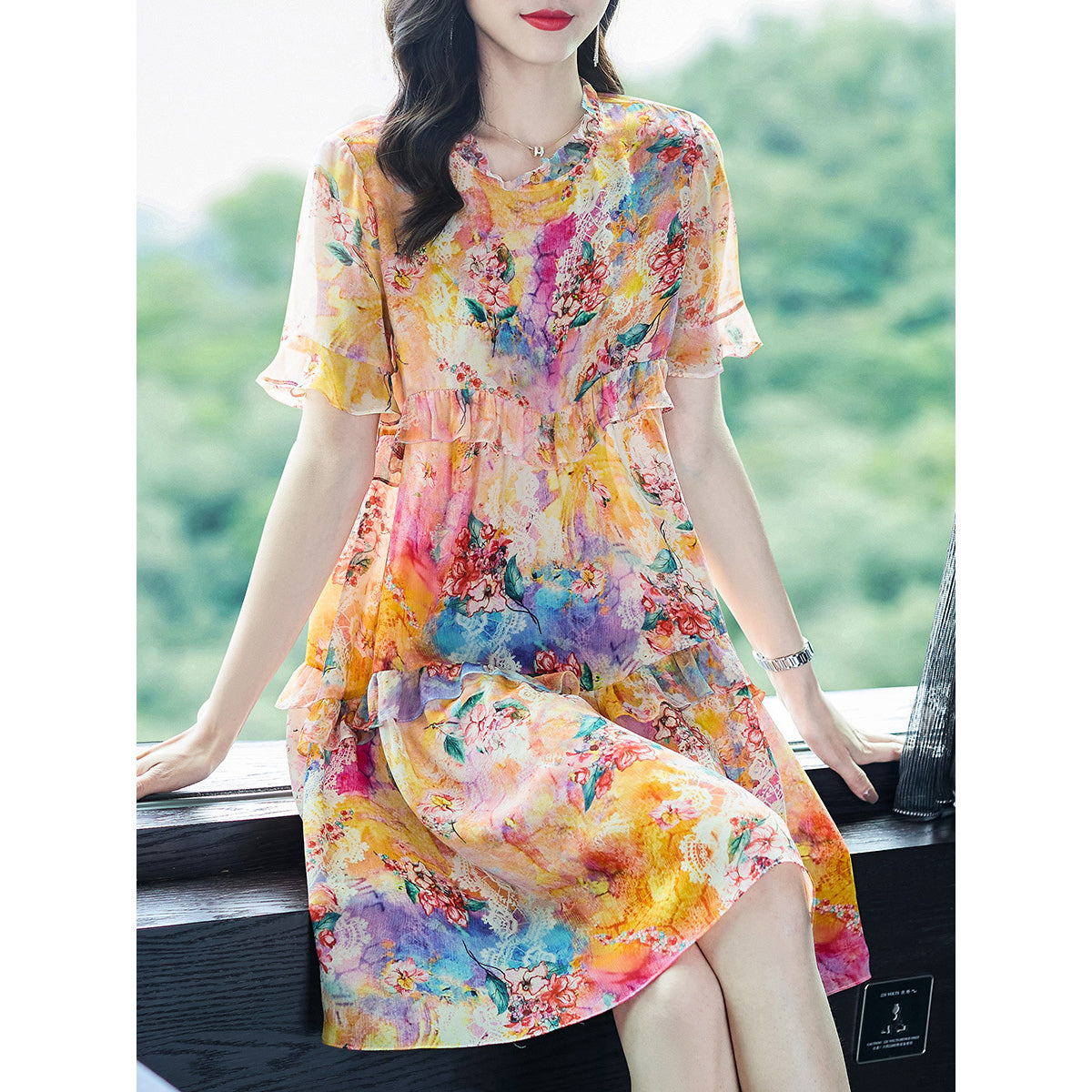 Radiate joy in this vibrant silk dress, featuring a painterly floral print in yellow, pink, purple, and blue hues. Soft ruffled sleeves and a tiered design add feminine charm, while the breathable silk fabric ensures comfort and elegance for sunny days and casual outings.