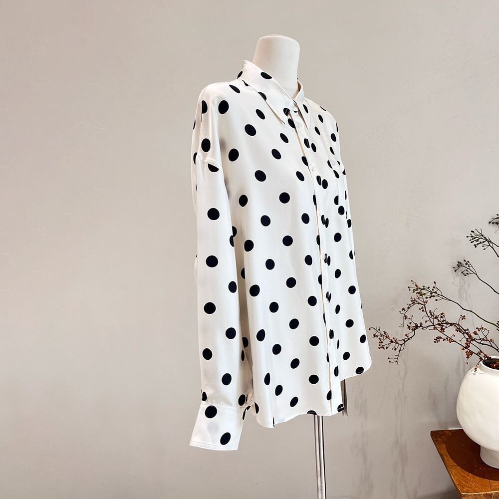 Elevate your everyday wardrobe with this luxurious women’s silk shirt, featuring a timeless white base with bold black polka dots. Made from 100% silk, it offers a smooth, soft texture and natural sheen that brings elegance to any outfit. The design includes a classic collar, chest pocket, and button-up front, with long sleeves you can roll for a more relaxed vibe. Light, breathable, and effortlessly stylish, it’s perfect for workdays, weekend brunches, or chic café moments.