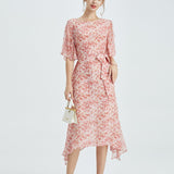 This silk chiffon midi dress showcases a delicate allover print with softly ruffled short sleeves and an asymmetrical hemline for added elegance. The self-tie waist belt enhances the feminine silhouette, offering a flattering, adjustable fit. Lightweight and breathable, it’s ideal for daytime events, brunches, or vacation wear with effortless style.